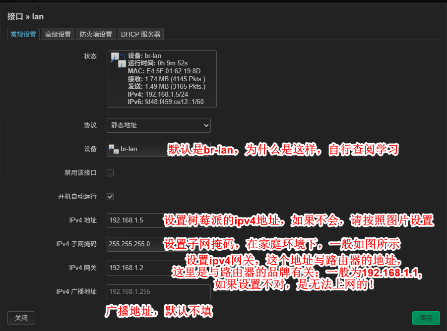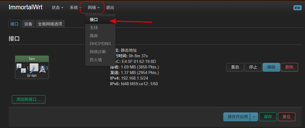 在 LuCI Web 页面中进入:网络 -> 接口,找到 LAN(或你要修改的接口),点击 编辑。