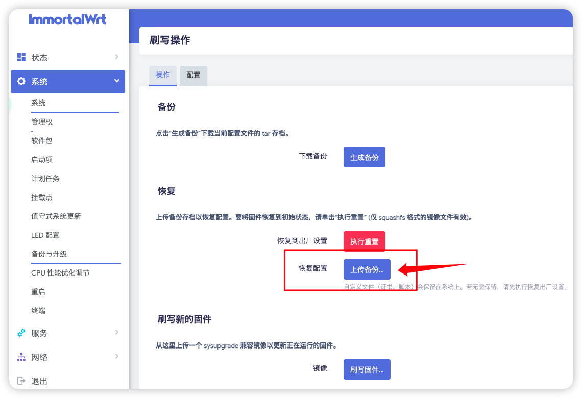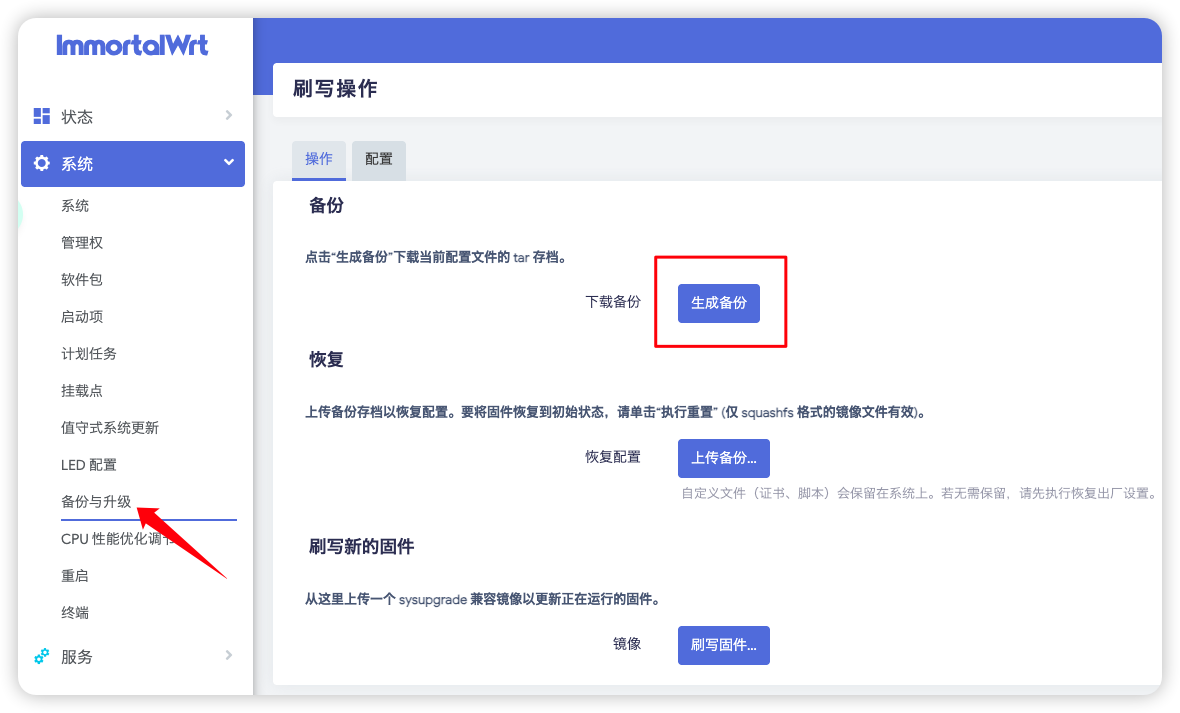 系统 -> 备份与升级 -> 生成备份备份系统相关配置:(保存文件到本地)