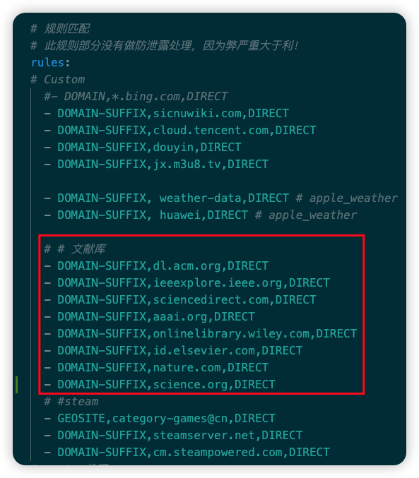 rules的# Custom或# 文献库区域添加直连规则,例如:DOMAIN-SUFFIX,example.edu,DIRECTDOMAIN,sub.example.edu,DIRECTIP-CIDR,1.2.3.0/24,DIRECT,no-resolve